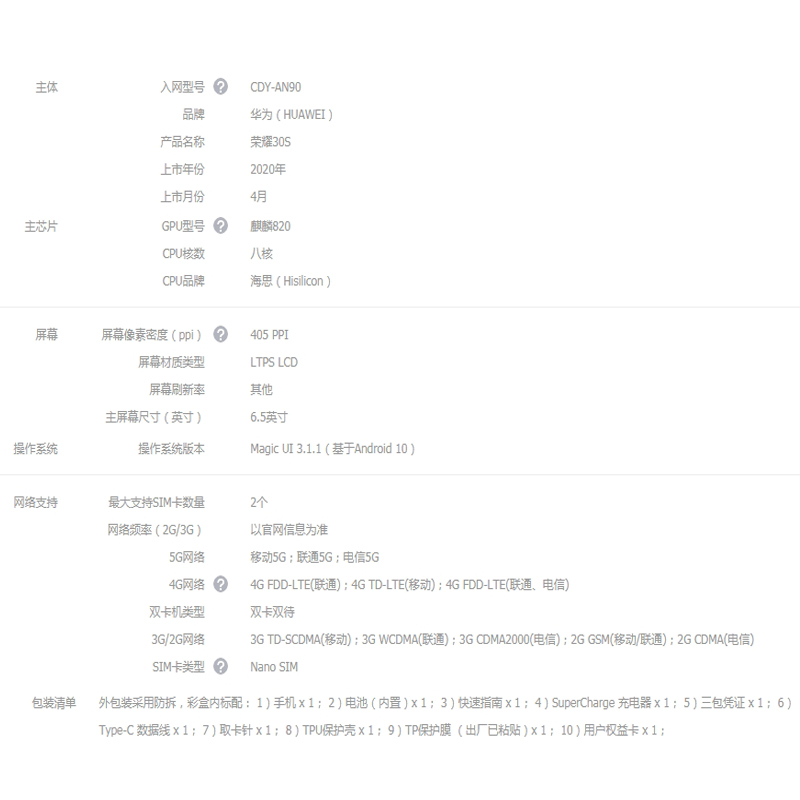 荣耀30S 双模5G 麒麟820 5G SOC芯片 8GB+256GB 幻夜黑【其他/幻夜黑】 |